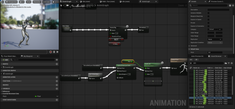 I was given access to all of the players animations and the player's blueprints in order to begin working on creating the best animations we could deliver within our limited time frame. I was in charge of fixing the players broken locomotion and state machines, but after looking over what was done beforehand, I decided to create a new state machine from scratch.